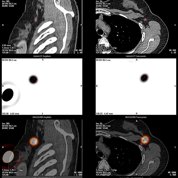 Un des médecins nucléaires du service réalisera jusqu’à quatre injections péri-aréolaires (autour du mammelon) de radiotraceur (produit faiblement radioactif).